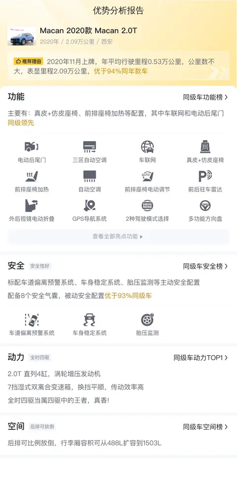 这辆Macan 2020款 Macan 2.0T在功能配置上丰富且实用。首先,其座椅采用真皮+仿皮的材质,兼顾了舒适度与质感;前排座椅加热功能则确保了冬季驾驶的舒适性。其次,电动后尾门增添了使用的便捷性,而车联网功能不仅方便了导航与娱乐,也使得车辆更具科技感。此外,全LED大灯、自动大灯以及弯道辅助照明等功能,不仅提升了夜间行车的安全性,也展现了保时捷在细节上的匠心独运。这些配置综合体现了保时捷Macan作为一款豪华SUV,在追求驾驶乐趣的同时,也不忘为驾驶者与乘客提供高级别的舒适体验与安全保障。