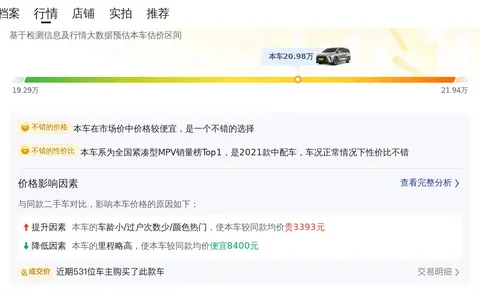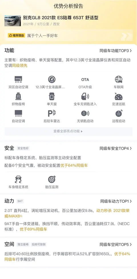 该车作为一款2021款的别克GL8 ES陆尊653T舒适型,首次上牌时间为2021年9月,至今行驶里程为9万公里,车源地与上牌地均为西安,车身颜色为香槟色,新车指导价为31.39万,如今二手车报价20.98万,目前0过户。