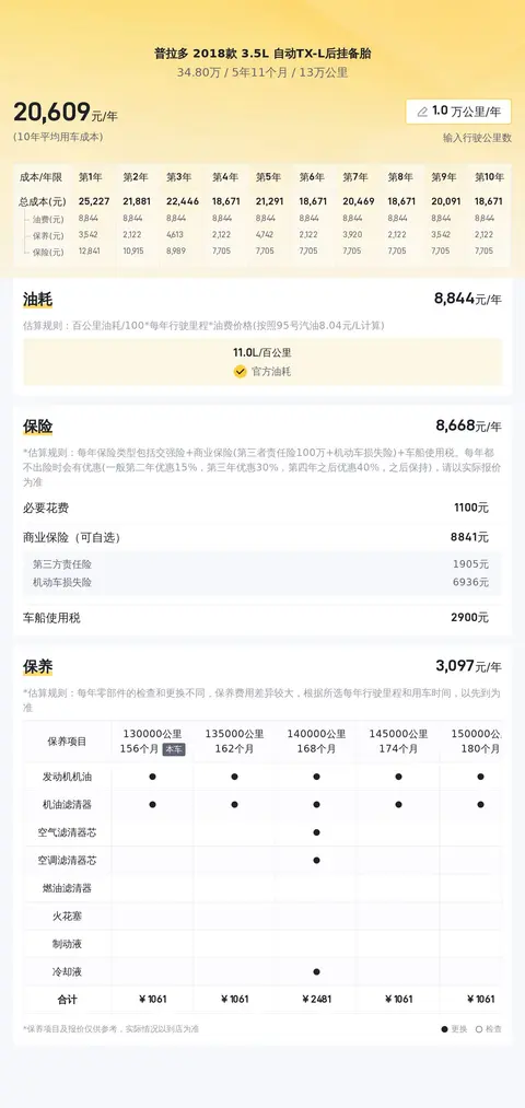 市场行情方面,当前这款普拉多的二手车价位大致在30万至36万左右。用车成本方面,依据估算,这辆车的年均综合用车成本在2万元上下。当然,具体的实际费用开销会根据车主不同的使用习惯和养护方式有所变动。