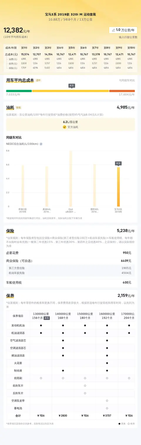 宝马3系2019款320i M运动套装的用车成本主要包括燃油、保养、保险以及洗车和打蜡等方面的费用。其中,燃油费用是最大的支出之一。根据官方数据,这款车的百公里综合油耗为6.2升。按照每年行驶2万公里计算,每年的燃油费用大约为11667元。保养费用也是不可忽视的一部分。这款车的保养周期为1年或1万公里,每次保养的费用大约为1804元。按照每年保养一次计算,每年的保养费用大约为1804元。保险费用方面,交强险加商业险的保费大约为5105元。洗车和打蜡等方面的费用因人而异,按照每年5次,每次50元计算,每年的费用大约为250元。综上所述,宝马3系2019款320i M运动套装的年用车成本大约为19161元。需要注意的是,实际用车成本可能会因个人驾驶习惯、用车频率、油价波动等因素而有所差异。