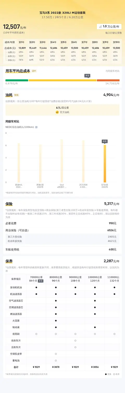 根据懂车帝的大数据分析,这辆车的10年平均用车成本约为13,347元/年,与同级别竞品相比处于适中区间,既有性价比,又能保障日常使用的需求。这一数据基于多种因素进行了综合考量,包括油费、保养费、保险费等常见用车支出。然而,请注意,个别车主可能会根据各自的驾驶习惯、用车频率和地区差异等因素经历些许不同的费用支出。为确保数据的相关性和准确性,我们分析比较了同级别竞品车型的市场表现,以提供给您最贴近实际的用车成本评估。