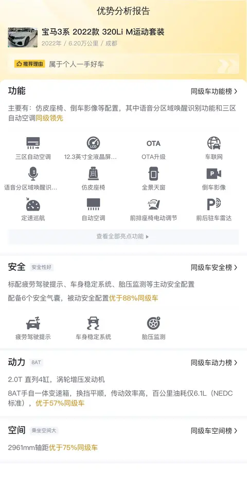 综上所述,这辆宝马3系 2022款 320Li M运动套装是一款集豪华、舒适、动力于一身的二手车。它不仅拥有出色的外观和内饰设计,更在动力性能和操控性能方面表现出色。如果你正在寻找一辆性价比高的二手车,那么这辆车绝对是一个不错的选择。但需要注意的是,在购买二手车时一定要仔细检查车辆的状况,避免购买到有问题的车辆。希望每一位购车者都能购买到一辆既经济实惠又性能卓越的二手车!