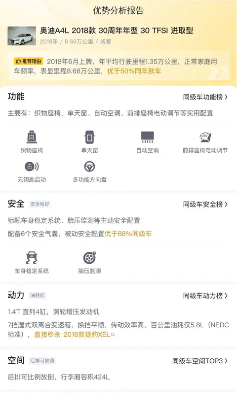 综上所述,这辆二手奥迪A4L 2018款 30周年年型 30 TFSI 进取型在价格、配置、性能以及空间等方面均表现出色。如果您正在寻找一款性价比高的豪华轿车,那么这辆车无疑是一个值得考虑的选择。需要注意的是,车辆的实际状况还需结合现场查看及试驾体验进行综合评估。最后,祝您购车愉快,享受驾驶的乐趣!