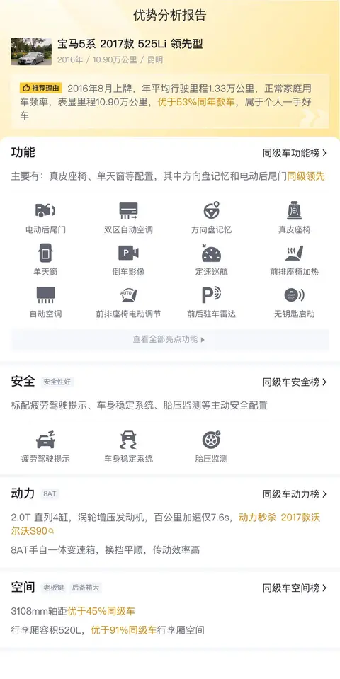 综上所述,本文所分析的二手车宝马5系 2017款 525Li 领先型在市场中具有一定的竞争力。其外观设计、内饰品质、动力性能、操控稳定性以及舒适性等方面均表现出色。然而,由于车辆已行驶10.9万公里且使用时间超过8年,在购买前需特别关注车辆的实际状况,特别是潜在的重大事故、水泡和火烧风险。此外,车辆配置的方向盘记忆调节、电动后尾门等智能舒适化配置也为驾驶者和乘客带来了更加便捷和愉悦的驾乘体验。总体而言,若车辆实际状况良好且价格合理,该二手车宝马5系 2017款 525Li 领先型是一款值得推荐的车型。