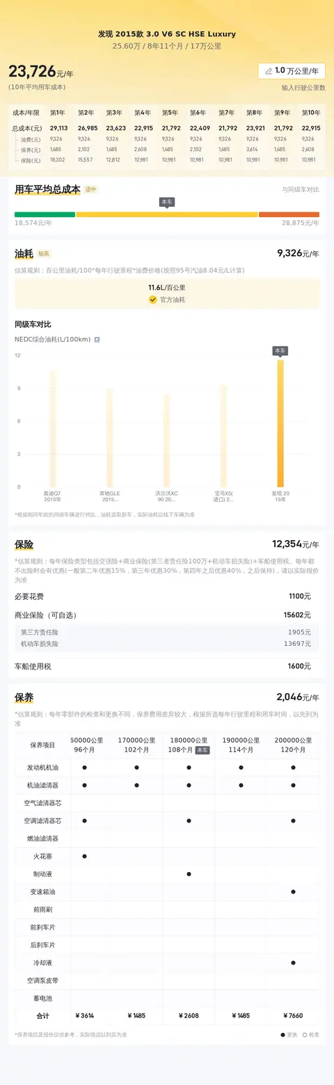 说到用车成本,这里不得不提一下,这辆发现的用车成本并不便宜。根据估算,这辆车的年均综合用车成本在2.4万元左右。这个花销是个什么水平呢?我们都知道,用车成本的高低跟车价有直接关系。简单说,车价越贵,相应的用车成本也越高。拿咱老百姓常说的话就是,什么车有什么样的车厘子。所以,这辆车这么高的用车成本也就不难理解了。