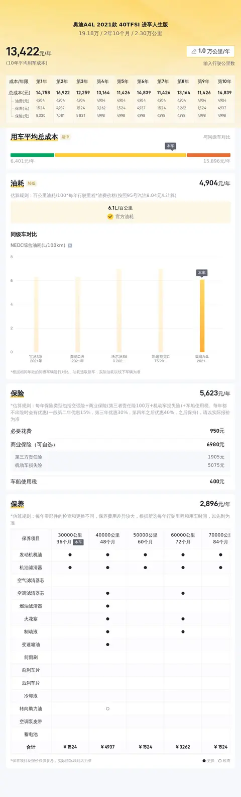 根据大数据分析显示,这辆奥迪A4L 40TFSI 进享人生版的二手车报价在19.18万元,价格相对合理公允。从用车成本角度来看,这辆奥迪A4L的官方百公里油耗为6.1升,按照每年行驶2万公里计算,每年的油费约为11136元。保险费用方面,每年大约需要7399元,包括交强险、商业险和车船使用税。保养费用方面,每年大约需要3188元,包括常规保养和零部件更换等。洗车美容费用方面,按照每年洗车12次计算,每次37元,每年大约需要444元。总体来说,这辆奥迪A4L的年均综合用车成本约为每年2.2万元左右。具体费用金额可能会根据个人用车习惯、保险公司政策和地区差异等因素有所不同,以上数据仅供参考。
