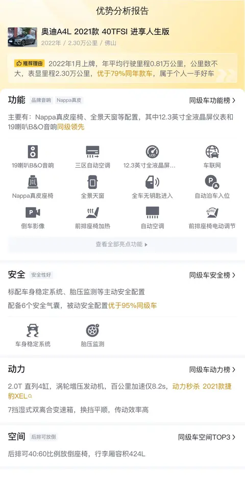 这辆2021款奥迪A4L 40TFSI 进享人生版,表显里程2.3万公里,符合国VI排放标准。该车于2022年1月在佛山上牌,并且车源所在地也在佛山,至今未有过过户记录。新车指导价为35.44万元,而当前的二手车报价为19.18万元,相比新车价格便宜了16.26万元。