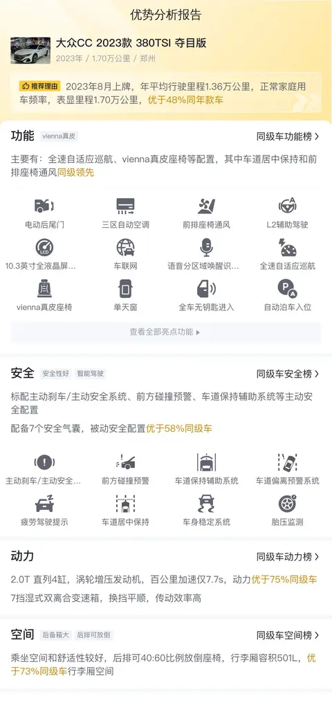 优势:准新车,跑的少,基本就是准新车的状态,价格却比新车便宜很多,属于比较划算的那一种。而且这款大众CC是高配车型,配置丰富,安全性也高,动力强劲,是一款比较不错的车型。