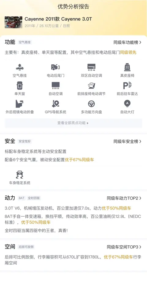 据估算,同级车的最低用车成本是17782元/年,最高是28715元/年,Cayenne 2011款 Cayenne 3.0T是26058元/年,所以用车成本偏高。