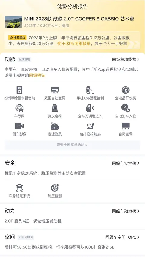 这辆MINI艺术家配置还是不错的,配备了真皮座椅、全车无钥匙进入、未知寸全液晶仪表盘等配置,其中手机App远程控制和12喇叭哈曼卡顿音响同级领先。在安全方面,这辆车做得也挺到位。它配备了多种主动安全配置,包括但不限于ABS防抱死制动系统、EBD电子制动力分配系统、EBA刹车辅助系统、ASR牵引力控制系统以及ESP车身稳定控制系统,这些技术共同作用于提升车辆在行驶过程中的稳定性与可控性,尤其是在恶劣天气或复杂路况下,能够有效预防车辆失控或打滑等情况的发生,为驾驶者提供更高级别的安全保障。在被动安全配置方面,这辆车同样表现出色,它配备了多个安全气囊(包括前排正面、侧面气囊以及头部帘式气囊),旨在通过减少碰撞时对乘客的直接冲击来最大限度地降低伤害程度。此外,该车还配备了ISOFIX儿童座椅接口等实用配置,确保儿童乘客在行驶过程中的安全与舒适。综合来看,这辆车在配置和安全方面表现良好,为用户提供了舒适的驾乘体验和全面的安全保障。