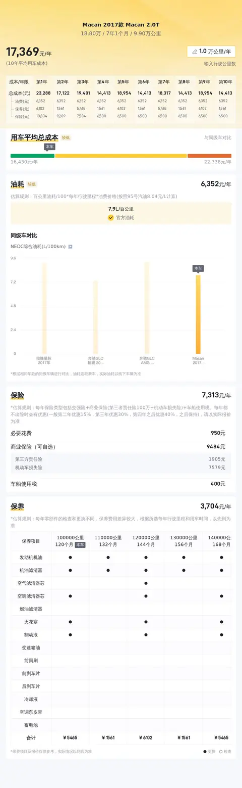 据估算,Macan 2017款 Macan 2.0T的用车成本较低,因为同级车的最低用车成本是16998元/年,最高是22720元/年,而Macan 2017款 Macan 2.0T是17180元/年,所以较低。