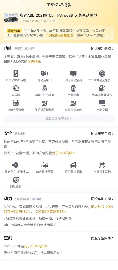 我们购买一辆车,经常需要考虑两方面,一方面是如何用车,另外一方面是如何选车。从选车的角度讲,这辆奥迪A6L搭载3.0T V6,涡轮增压发动机,48V轻混,百公里加速仅5.6s,动力秒杀2021款宝马5系PHEV、2021款雷克萨斯ES。从用车角度讲,A6L的乘坐空间和舒适性较好,3024mm轴距优于46%同级车,行李厢容积430L,能够很好的满足长途旅行时的行李存放。