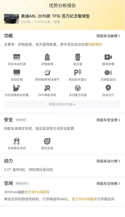 综合来看,这款车的优点有三:第一,品牌知名度,奥迪A6L在国内市场的知名度颇高,有着较好的市场口碑和认可度。第二,后排乘坐空间较为宽敞,适合家庭使用和接待需求。第三,车辆搭载的发动机动力输出平稳,可以满足日常驾驶需求。