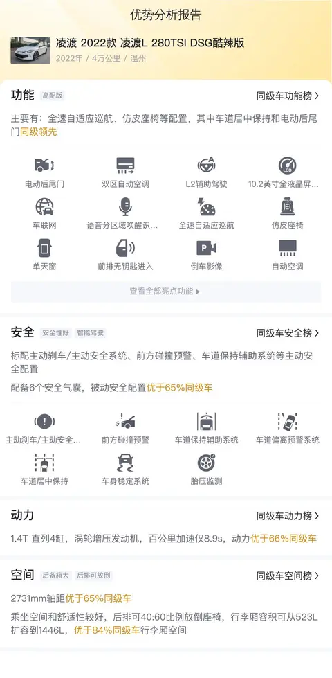 这辆凌渡 2022款 凌渡L 280TSI DSG酷辣版优点在于凌渡本身就有不错的市场认可度,而这辆凌渡L是改款后模样,吸引了不少年轻人的目光,并且内饰也有较大改动,科技感明显。1.4T的动力也完全够用,空间表现也不错。