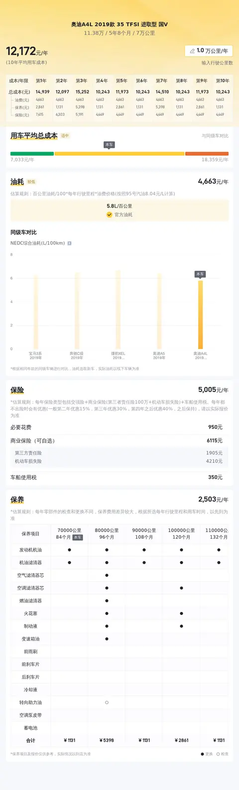 经过懂车帝大数据分析,这辆奥迪A4L 2019款 35 TFSI 进取型的10年平均用车成本大概是12170元/年,与同级别车相比处于中间值,油耗5.8L/百公里,与同级别车相比处于较低水平,保值率也比较高,对于消费者来说,是比较经济实惠的选择。