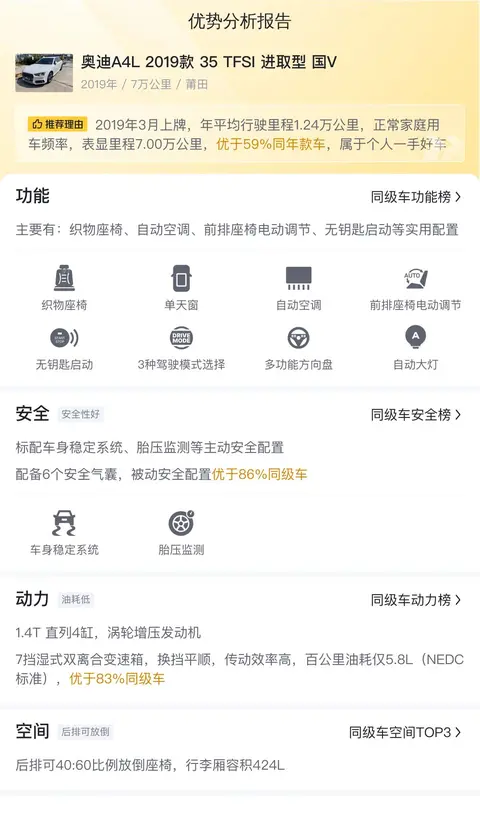 这辆奥迪A4L 2019款 35 TFSI 进取型在动力、油耗、配置、外观和舒适度方面都表现出色,是一款值得推荐的豪华轿车。然而,它也存在一些不足之处,例如内饰材质和隔音效果有待提升。尽管如此,总体而言,这款车仍然是一款非常优秀和值得购买的车型。