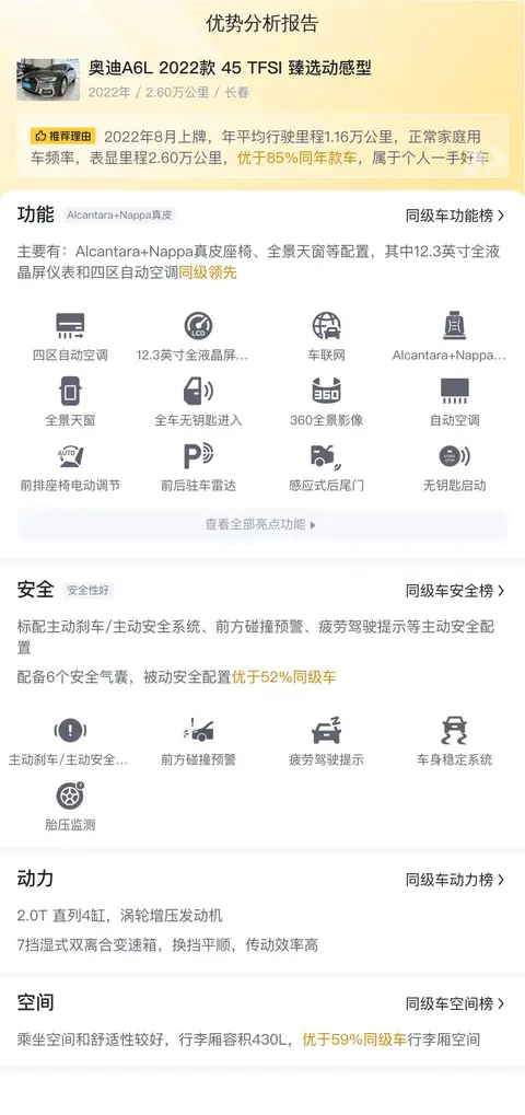 优劣势分析方面,这辆奥迪A6L 2022款 45 TFSI 臻选动感型在内饰、动力、操控以及舒适性方面都有着出色的表现。强劲的动力为驾驶者提供了充沛的动力输出,操控性和舒适性的均衡使得它成为商务与家庭出行的理想选择。然而,与其他同级别车型相比,奥迪A6L的养车成本相对较高,这对于一些预算有限的消费者来说可能是一个需要考虑的因素。此外,虽然内饰豪华且有科技感,但部分细节处理上仍有提升空间。