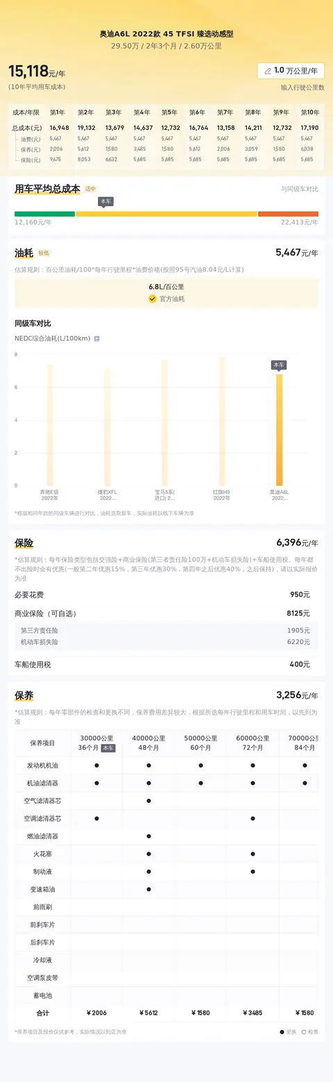 综上所述,奥迪A6L 2022款 45 TFSI 臻选动感型在内饰豪华、动力强劲以及操控舒适等方面表现出色,是一款集商务与家庭用车于一体的优质车型。在养车成本方面,虽然相对较高,但对于追求高品质生活的消费者来说,这仍然是一个可以接受的选择。希望今天的文章可以帮助到正在犹豫中的你哦!