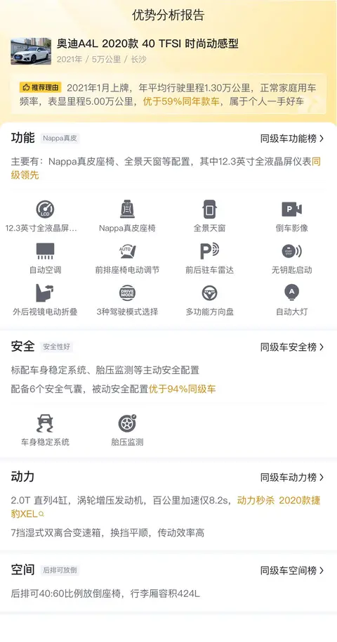 综上所述,这辆二手奥迪A4L 2020款 40 TFSI 时尚动感型不仅价格合理,而且在车辆状况方面也表现出色。它拥有出色的性能、精致的内饰、丰富的配置以及宽敞的空间和实用性。作为一款豪华轿车,它在日常驾驶和长途旅行中都能为驾驶者和乘客带来舒适的体验。如果您正在寻找一款性价比高的二手豪华轿车,那么这辆奥迪A4L无疑是一个值得考虑的选择。