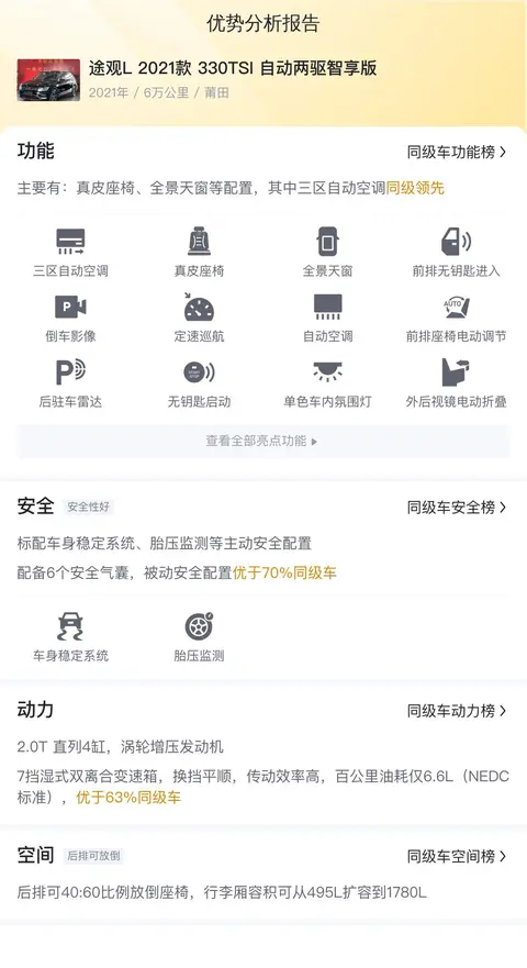 综上所述的新车含税价、用车成本、市场行情、优势分析、同款比价等数据仅供参考。在配置部分,因为二手车非标品,车辆可能会存在配置改装的情况,具体车况信息需要线下结合车辆实际情况进行综合参考。