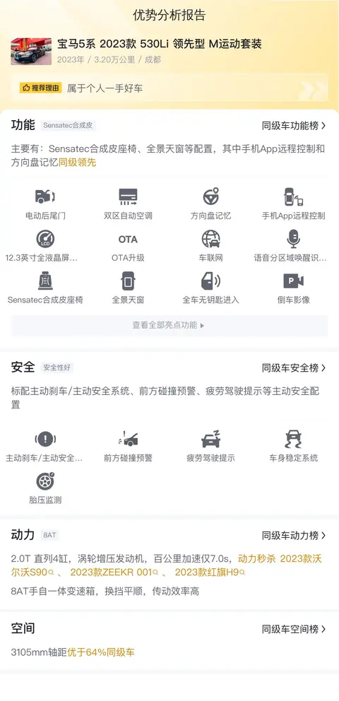 缺点:价格太高了,一般的家庭压力大,受众人群少。林肯大陆、大众辉昂、奥迪A6L、捷豹XFL、沃尔沃S90等竞品车型最低二手价才21.88万,而这辆宝马5系 2023款 530Li 领先型 M运动套装的报价35.5万,二手价甚至高出了某些竞品新车指导价,所以价格很不合理。此外,豪车虽然好,但是保养费用也高,燃油经济性也不是很高,家用的话成本有点高。
