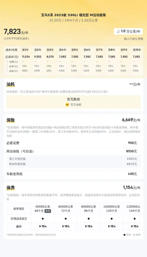 据估算,宝马5系 2023款 530Li 领先型 M运动套装的用车成本是7150元/年,同级车最低是6106元/年,最高是16781元/年,所以它的用车成本偏低。