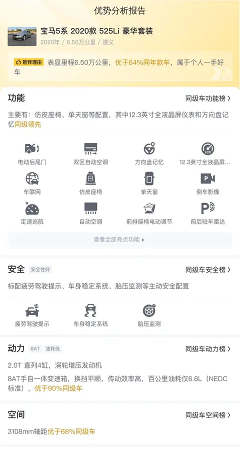据估算,同级车的最低用车成本是6506元/年,最高是18790元/年,宝马5系 2020款 525Li 豪华套装是14744元/年,用车成本不算低。