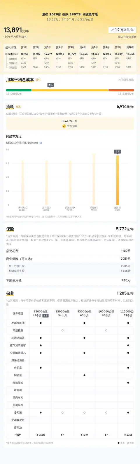 关于用车成本方面,根据懂车帝平台的大数据估算,这款途昂的年度用车成本大约在1万4千元。这里要说的是,实际费用支出可能会根据用车强度和环境等因素有所变动。