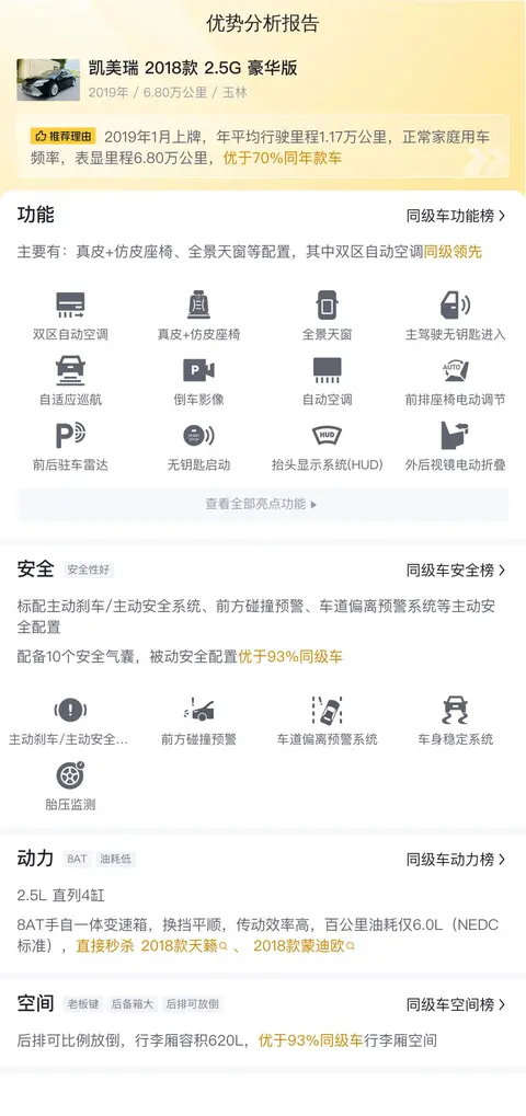 综上所述的新车含税价、用车成本、市场行情、优势分析、同款比价等数据仅供参考。在配置部分,因为二手车非标品,车辆可能会存在配置改装的情况,具体车况信息需要线下结合车辆实际情况进行综合参考。