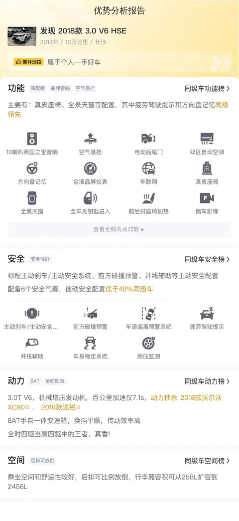 综上所述,对于追求豪华驾乘体验与卓越越野性能的消费者而言,发现2018款3.0 V6 HSE无疑是一个极具吸引力的选择。其合理的二手车估价、较低的过户次数以及在动力、空间、内饰等方面的出色表现,都为其增添了更多的市场竞争力。同时,潜在买家也应考虑到该车型的维护成本相对较高,特别是在油耗与保养方面的投入。因此,在做出购买决策之前,建议消费者根据自身经济条件、使用需求以及个人偏好进行综合考量,选择最适合自己的车型。最后,不得不提醒大家,买车开心,也要量力而行哦!