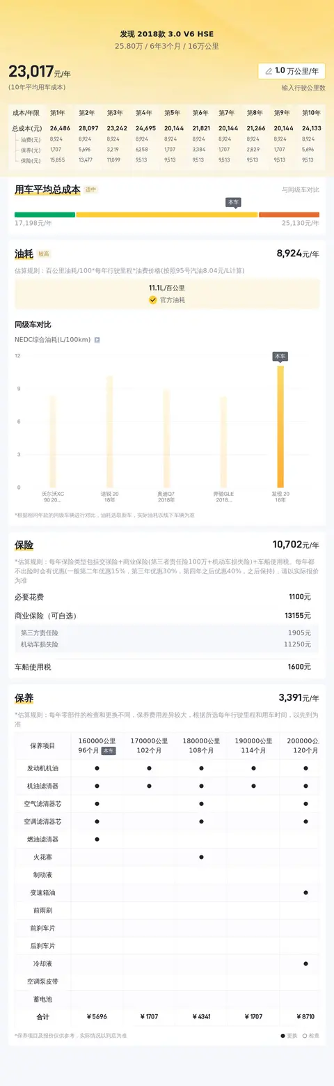 在考虑购买二手车时,除了购车成本外,还需要合理预期日常使用与保养的费用。根据行业数据,发现2018款3.0 V6 HSE的年均综合用车成本大约为2.3万元左右,这包括了油费、保养费及保险费等常规开支。值得注意的是,实际费用可能会因个人驾驶习惯、车辆维护状况及地区生活成本等因素而有所浮动。因此,潜在买家应根据自己实际情况,合理评估并规划用车预算。