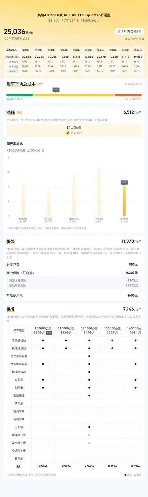 根据大数据测算,这款奥迪A8的年均综合用车成本约2.5万元左右,这项开支具体金额跟车主的驾驶习惯和行车环境有直接关系。