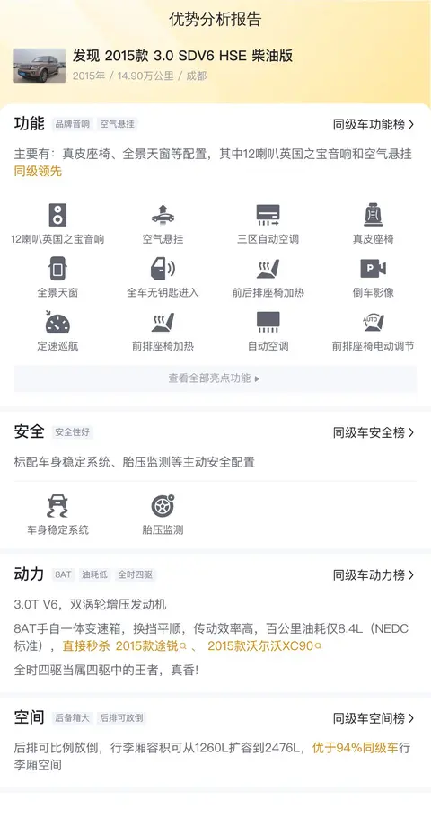 发现 2015款 3.0 SDV6 HSE 柴油版配备了真皮座椅、全景天窗等配置,其中12喇叭英国之宝音响和空气悬挂同级领先。
