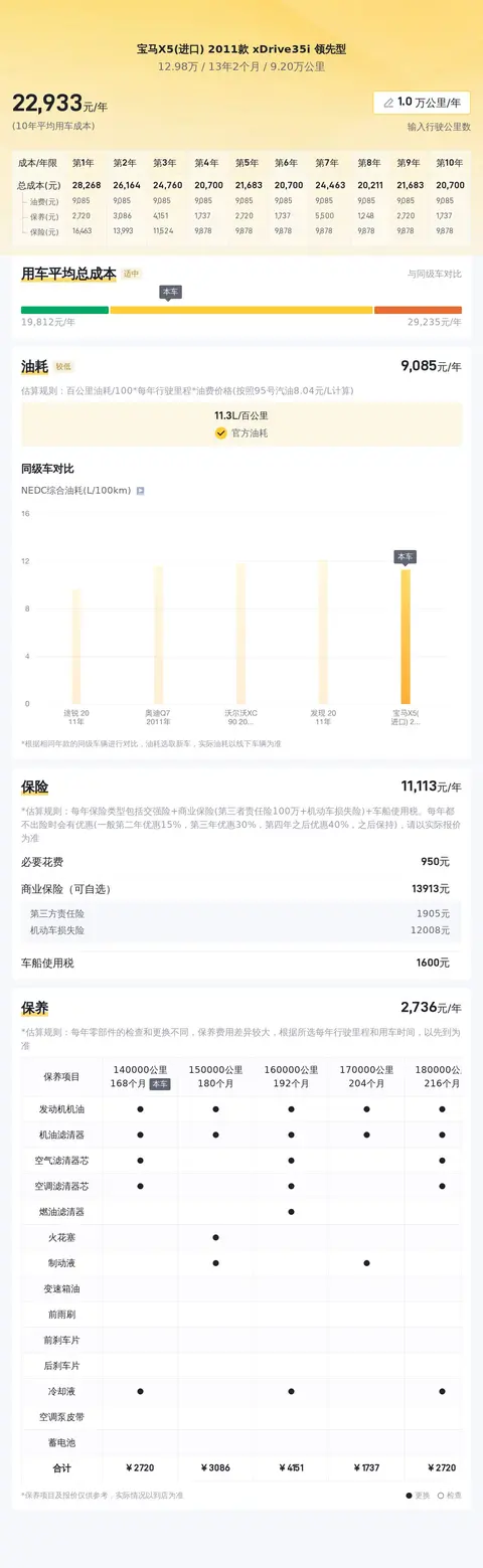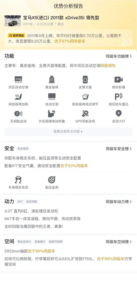 在竞争日益激烈的二手车市场中,每一款车型都拥有其独特的优劣势。对于这款2011款宝马X5 xDrive35i领先型而言,其优势主要体现在以下几个方面:首先,作为一款豪华SUV,宝马X5在品牌影响力和市场认可度方面具有明显优势。其次,该款车型搭载了3.0T涡轮增压发动机和8速手自一体变速箱,动力强劲且换挡平顺,为驾驶者带来了出色的驾驶体验。再次,宽敞的内部空间和舒适的乘坐感受使得宝马X5成为了家庭出行和长途旅行的理想选择。然而,这款宝马X5也存在一些劣势。由于车辆已经行驶了9.2万公里且经过一次过户,潜在的维护和维修成本可能会较高。此外,作为一款豪华车型,其日常使用和保养成本也相对较高。在购买二手车时,潜在买家还需要关注车辆的车况、维护记录以及是否存在任何潜在问题等因素。
