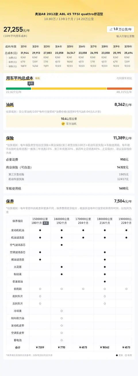 市场行情方面,当前这款奥迪A8L的二手车市场价格区间大致在7.99万至10.42万之间。用车成本部分,根据懂车帝对奥迪A8L 2012款 A8L 45 TFSI quattro舒适型的分析,其10年平均用车成本约为27187元/年。