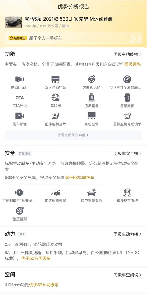 综上所述,这台宝马5系2021款530Li领先型M运动套装是一款性能出色、配置丰富、空间宽敞的中大型轿车,适合追求品质生活的商务人士和家庭用户。在二手车市场中,这款车的售价较为合理,保值率较高,是一款值得考虑的车型。不过,由于该车没有检测报告,所以还是那句话,具体车况还要通过实地看车才能获取。