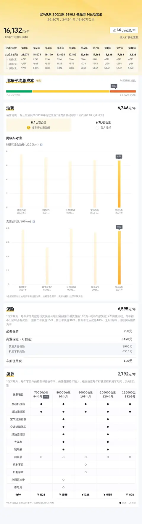 在用车成本方面,这台宝马5系的官方百公里油耗为6.7L,按照当前油价计算,每百公里油费约为56元,年均保险费用约为5635元,年均保养费用约为3371元,十年平均用车成本约为21710元/年,较同级别车型稍低。需要注意的是,实际用车成本可能会因驾驶习惯、路况、油价波动等因素而有所不同。