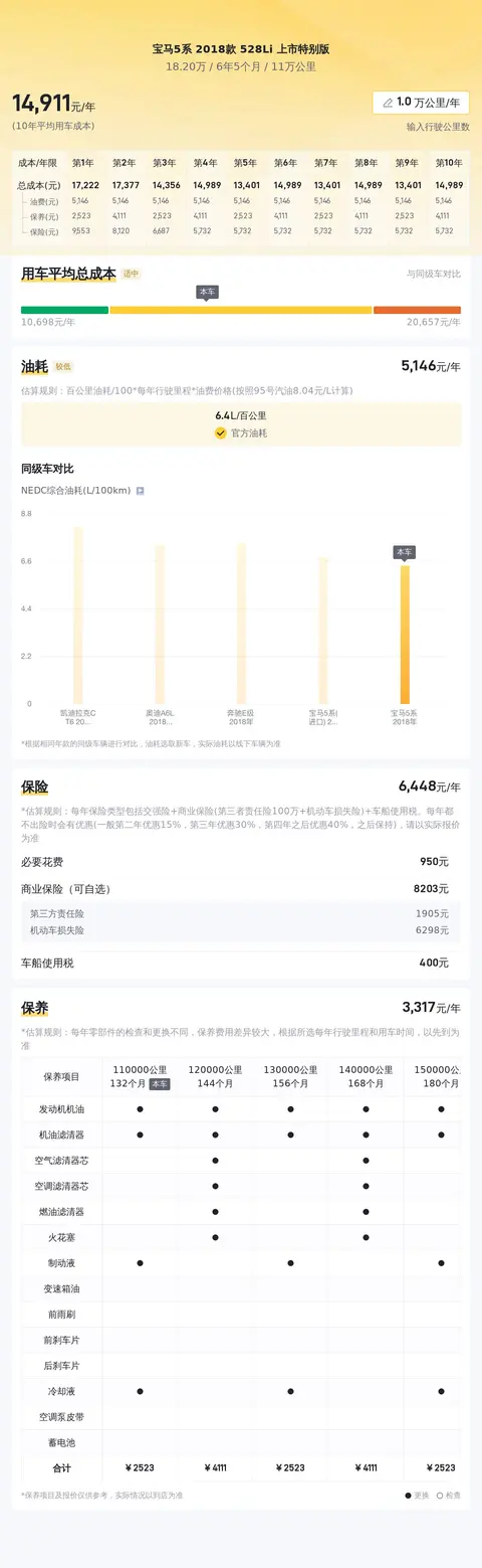 养车成本也是每个车主必须考虑的问题。根据估算,这款宝马5系 2018款 528Li 上市特别版的年均综合用车成本大约为1.5万元。这个数字可能会根据用车强度和环境等因素有所改变。但是,相对于同级别的其他车型来说,这个养车成本还是比较合理的。