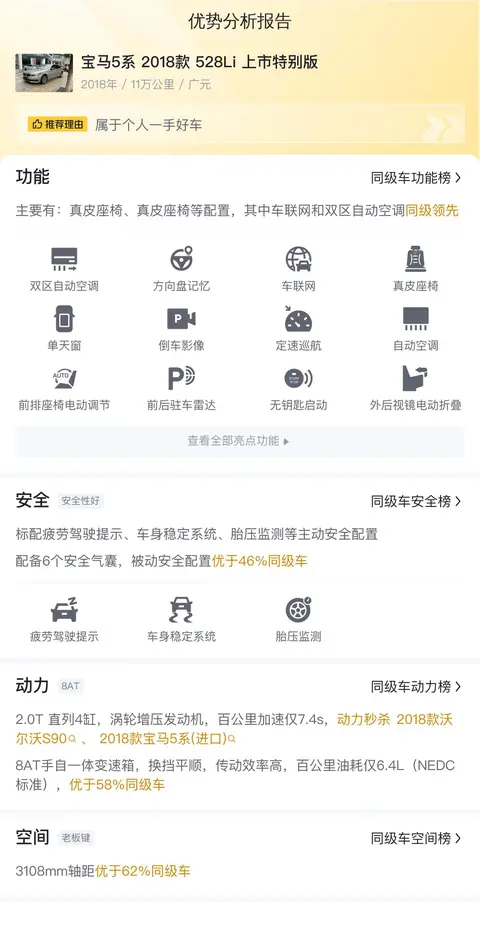 在同级别竞争对比下,宝马5系 2018款 528Li 上市特别版在动力、配置、空间、操控和舒适性等方面都表现出色。它搭载的2.0T发动机提供了强劲的动力输出,同时保持了良好的燃油经济性。车内配置丰富,包括高级真皮座椅、全景天窗等,为乘客带来舒适的乘坐体验。特别是其操控性能得到了消费者的高度评价,转向精准、底盘扎实,驾驶感受出色。然而,也有部分消费者反映内饰材质不如同级别部分车型,且保值率相对较低。总体而言,宝马5系 2018款 528Li 上市特别版是一款集豪华与性能于一身的中大型轿车,适合追求驾驶乐趣和高品质生活的消费者。