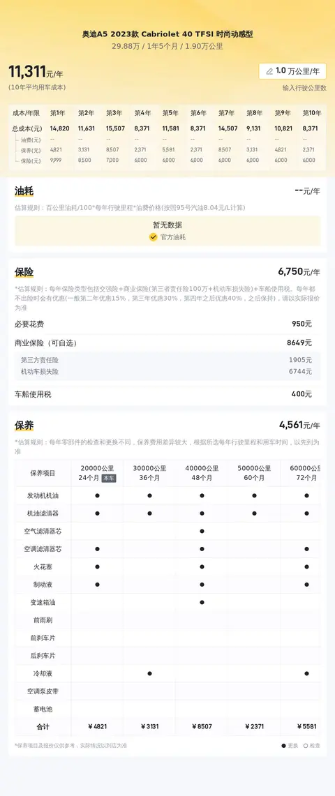 根据估算,这辆奥迪A5 Cabriolet 2023款 40 TFSI 时尚动感型的10年平均用车成本约为每年1.4万元。这一估算基于多种因素,包括油耗、保险费用和保养成本等。