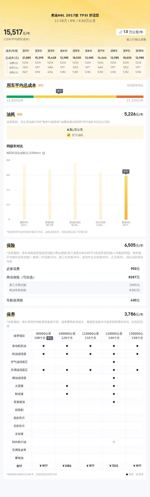 这辆奥迪A6L 2017款 TFSI 舒适型,根据估算,这辆车年均综合用车成本大概在每年1.6万元左右。实际费用开销会根据车主的实际使用状况有所变动。