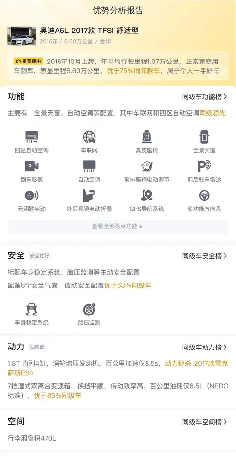 奥迪A6L 2017款 TFSI 舒适型在配置、性能、舒适性和价值保有方面表现出色,赢得了广泛好评。首先,其均衡的配置得到了用户的一致认可,尤其是对于追求高品质生活的消费者而言,这款车无疑是一个理想的选择。其次,车辆的动力性能和操控稳定性也获得了用户的高度评价,这主要得益于其所搭载的高效发动机和先进的底盘技术。再者,奥迪A6L 2017款 TFSI 舒适型还以其宽敞的内部空间和舒适的乘坐体验赢得了用户的青睐,无论是用于商务接待还是家庭出行都能游刃有余。最后,这款车在二手市场上的保值率也相对较高。