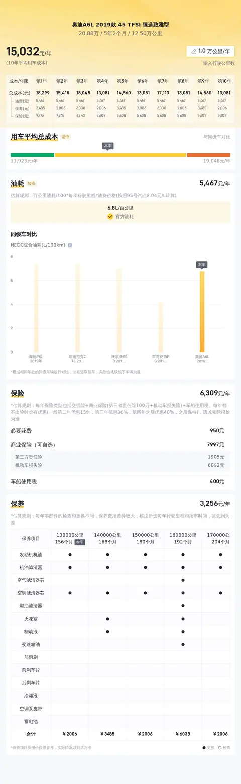根据估算,这辆车年均综合用车成本大概在每年1.5万元左右。油费约6611元/年,保险费用参考值为5530元/年,保养费用约为1111元/年,实际费用根据用车情况而定。