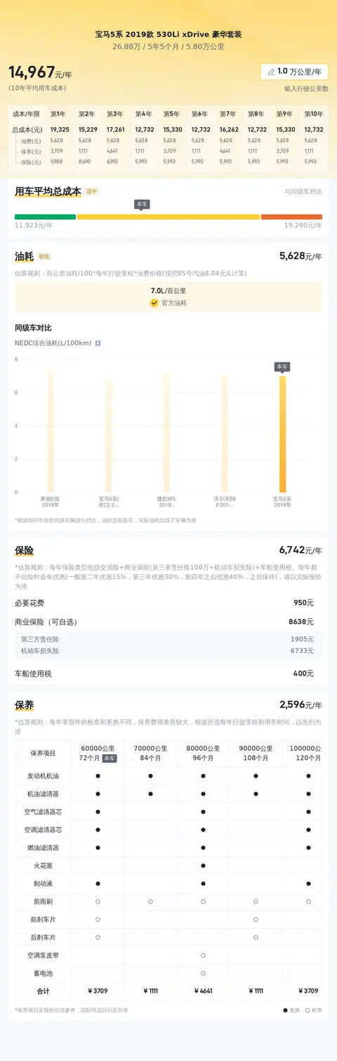 关于二手宝马5系 2019款 530Li xDrive 豪华套装的市场价格,可大体在20万至24万左右,当然这是根据诸多不同变量因素来决定的,诸如车辆的年限、里程以及维护状况等。而至于用车成本方面,该车的年均综合使用成本大约在1.5万元左右。当然,这个费用跟车主的用车习惯有着直接关系。