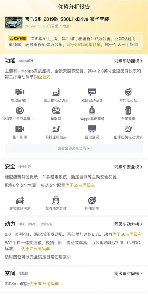 该车的具体版本是——宝马5系 2019款 530Li xDrive 豪华套装。该车于2019年5月在南京上牌,至今行驶里程为5.8万公里,未曾过户。这车的新车指导价为48.39万,如今二手车报价26.88万。