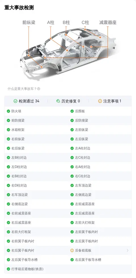二手车不同于新车,在日常使用中难免会发生一些小意外。比较常见的就是车辆外观覆盖件划伤、剐蹭、划痕、喷漆修复、钣金修复、凹陷、变形等,对于此类小瑕疵,虽然在检测项中会被查出来判定为瑕疵项,但整体并不影响车辆的安全性。总结说一下,如果车辆通过了重大事故、泡水、火烧检测检测,那么说明这辆车的整体车况没有大问题,这个您放心就行。
