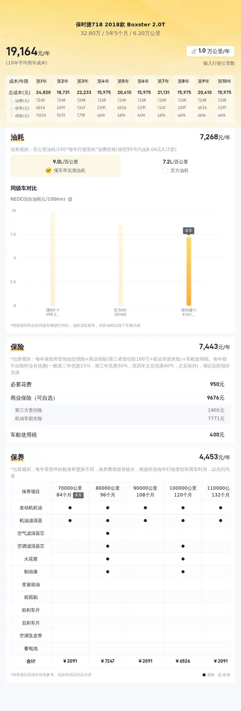 动力方面,该车搭载2.0T 水平对置4缸,涡轮增压发动机,匹配7挡湿式双离合变速箱,换挡平顺,传动效率高,百公里油耗仅7.2L(NEDC标准),优于57%同级车。关于油耗部分,虽然718作为跑车在油耗控制方面做得相对较好,但考虑到其高性能的定位,预期在激烈驾驶或高速行驶时,油耗可能会显著高于官方NEDC标准。