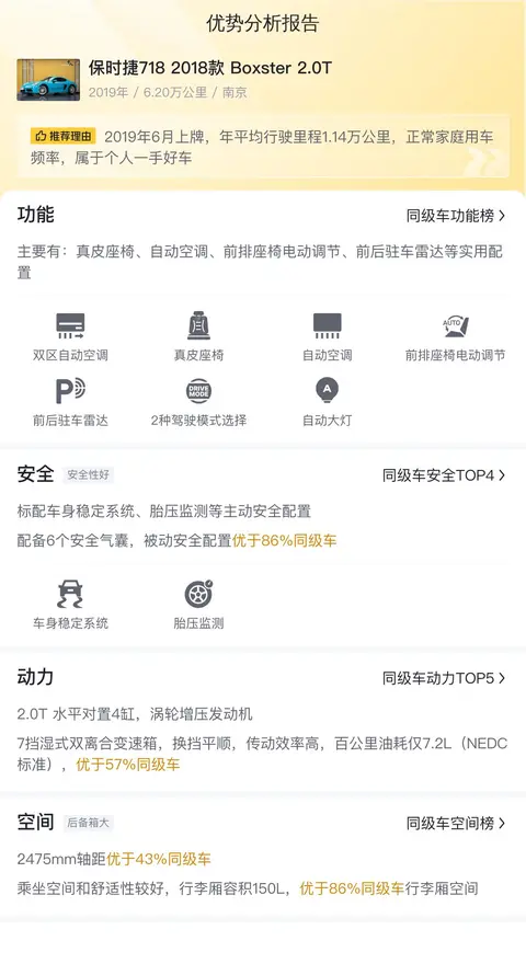 先介绍一下这辆二手保时捷718的基本情况,该车具体版本是——保时捷718 2018款 Boxster 2.0T,上牌地为南京,上牌日期2019年6月,表显里程6.20万公里,新车指导价56.50万,新车含税价61.63万,卖家现报价32.80万,过户次数显示该车未过户,车身颜色为蓝色,车源地为南京,上牌地为南京。