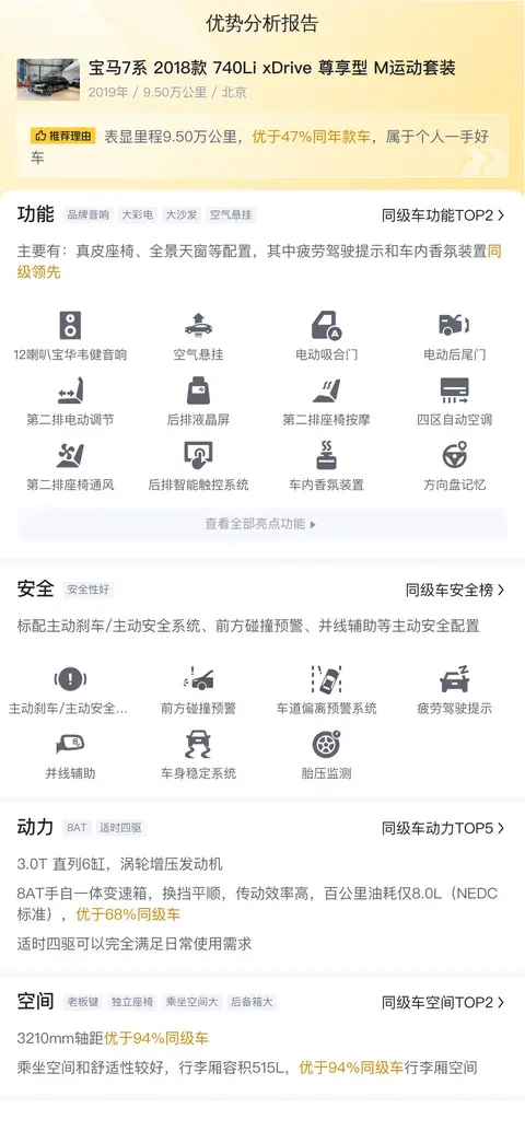 总结:这辆2018款宝马740Li xDrive尊享型M运动套装在外观、内饰、空间、动力、操控、舒适性、科技配置等方面均表现出色,是一款集豪华与性能于一身的旗舰级轿车。尽管车身较大,在城市驾驶和停车时稍显不便,但对于追求极致驾驶体验和豪华舒适乘坐感受的消费者来说,它无疑是一个理想的选择。作为二手车来说,这辆车的车况良好,行驶里程不多,且保养得当,可以作为一个不错的购车选项。最后还是要说一下,购买二手车不同的车况可以造就截然不同的体验,所以车况才是重中之重。由于这辆车没有检测报告,所以暂无法判断具体车况,建议您实地考察体验后再做定夺。