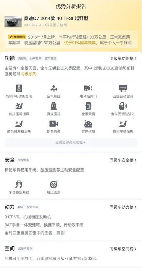 综上所述的新车含税价、用车成本、市场行情、优势分析、同款比价等数据仅供参考。在配置部分,因为二手车非标品,车辆可能会存在配置改装的情况,具体车况信息需要线下结合车辆实际情况进行综合参考。